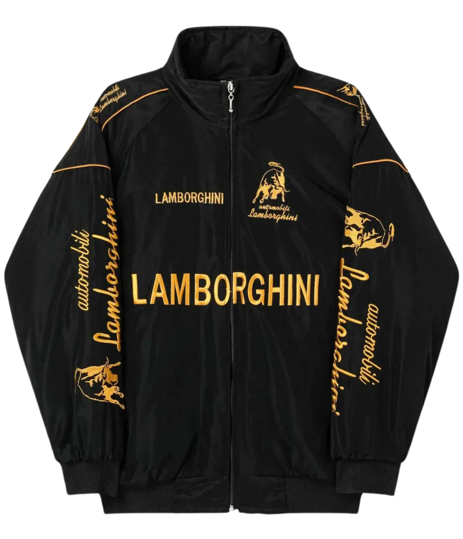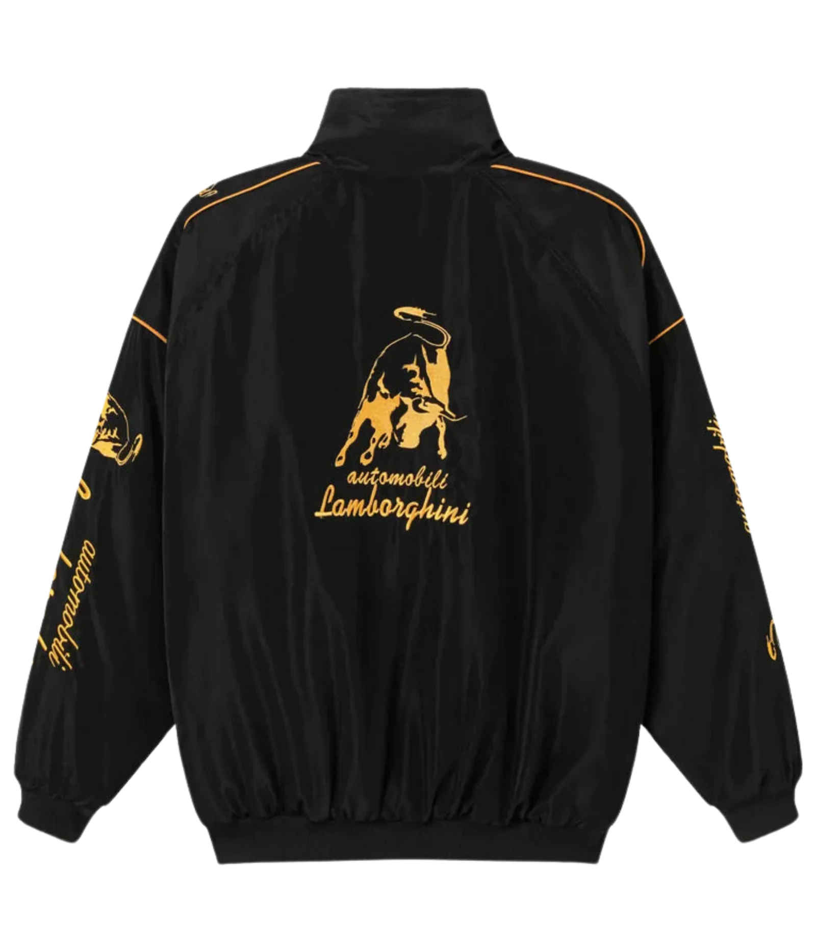 Stand out in this bold black and yellow Lamborghini racing jacket — a sleek vintage piece that blends luxury with motorsport attitude. Featuring embroidered logos down the sleeves and chest, this padded zip-up is perfect for turning heads while staying warm. Style it oversized for a streetwear edge or fitted for that classic racer silhouette.