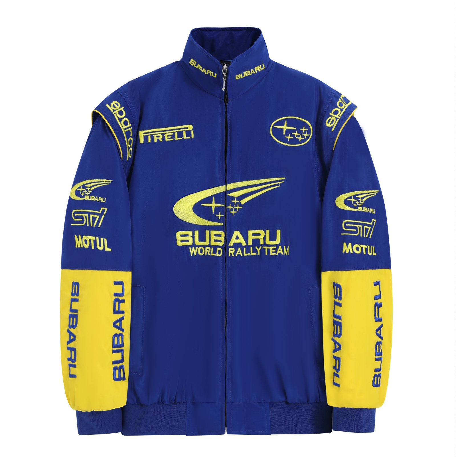 Electric blue and yellow windbreaker featuring bold Subaru World Rally Team graphics and sponsor patches. A lightweight, oversized fit built for standout street style with motorsport attitude. Vintage racing energy, reimagined for today.