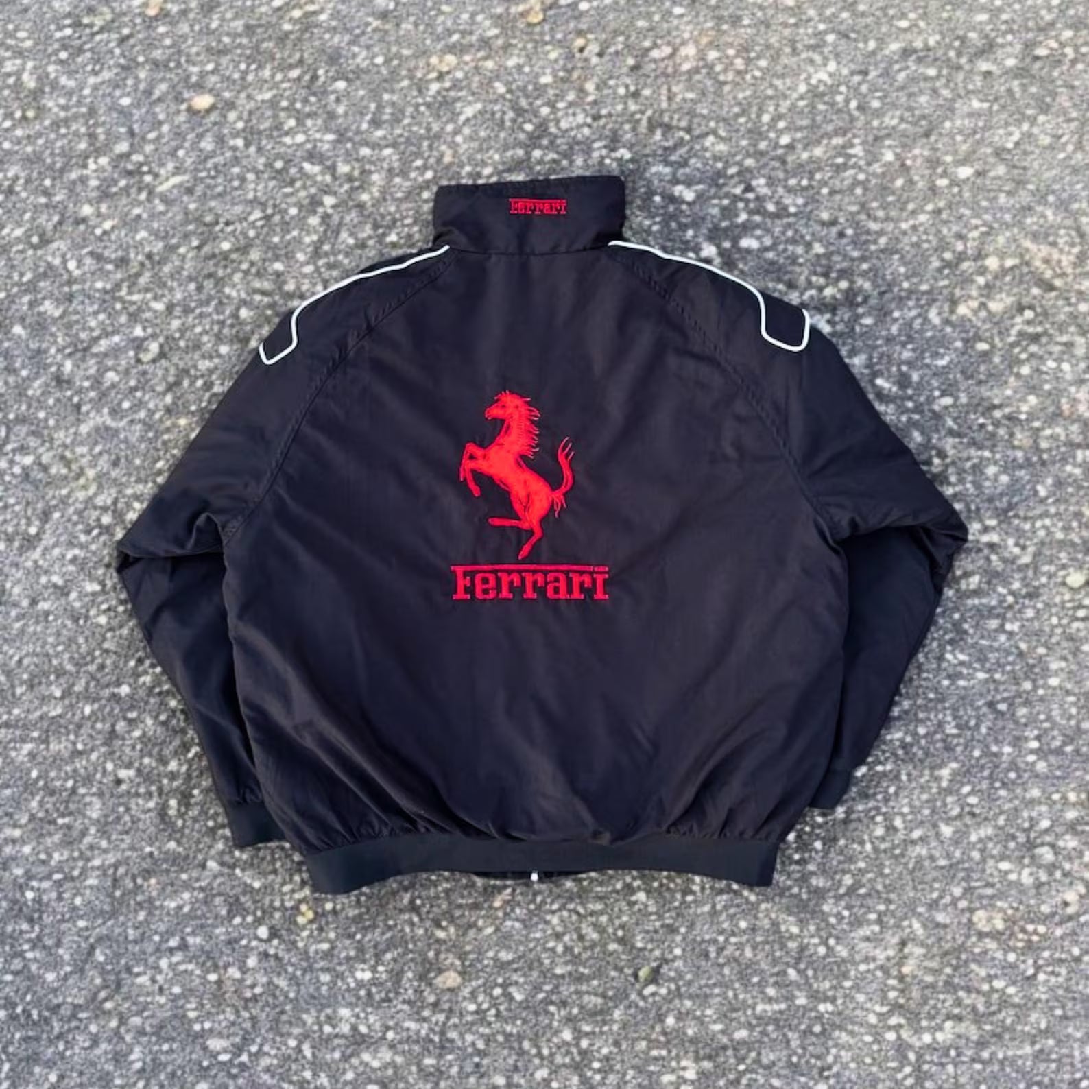 Classic black Ferrari racing jacket featuring bold Scuderia Ferrari patches and racing stripes. Detailed with sponsor logos and a retro F1 aesthetic, this lightweight windbreaker brings iconic motorsport energy to everyday streetwear. Ideal for fans of speed, heritage, and standout style.